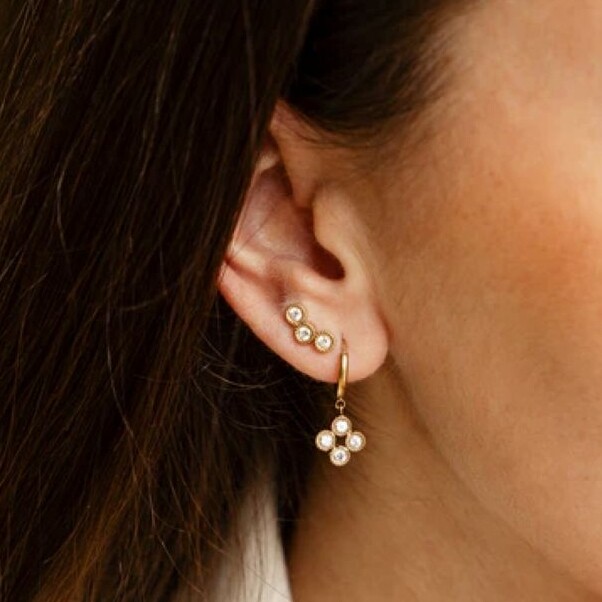 Boucles d'oreilles créoles en acier doré à l'or fin par ionisation serti d'une fleur composée de 4 petits ronds en zirconiums.