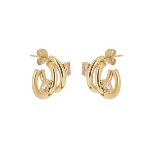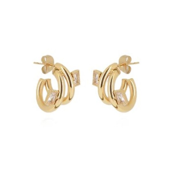 Boucles d'oreilles créoles double en acier doré à l'or fin par ionisation deux petits zirconiums en forme de rectangles sont sertis sur la créole.