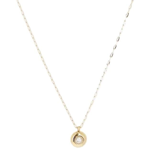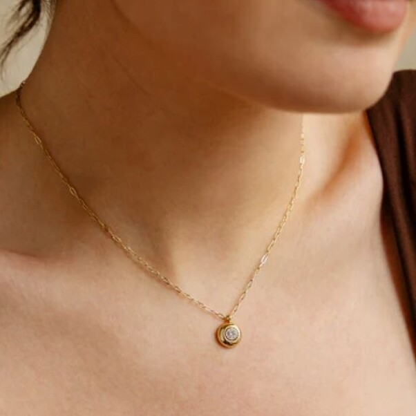 Collier en acier doré à l'or fin par ionisation composé d'un pendentif rond en acier au centre duquel se trouve un zirconium rond.